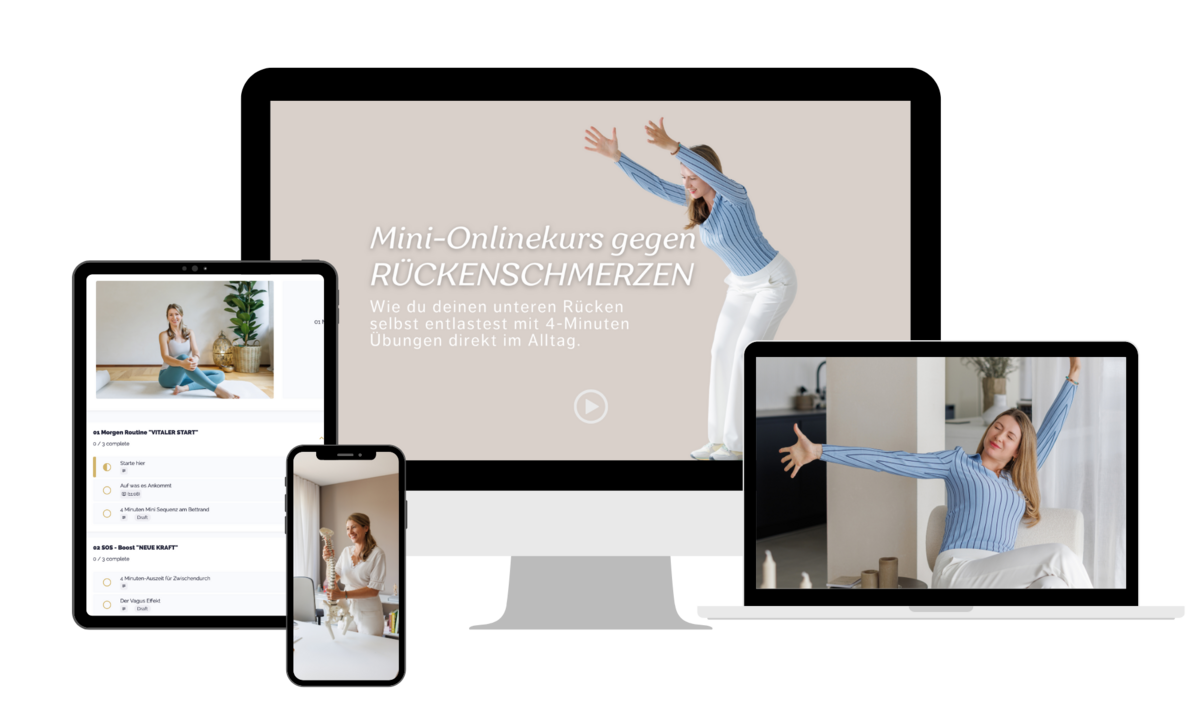In meinem Mini-Onlinekurs zeige ich dir, wie du Schmerzen im unteren Rücken linderst – mit 4-Minuten-Übungen für den Alltag und dem Verständnis, wie du dich langfristig kraftvoll und beweglich hältst.